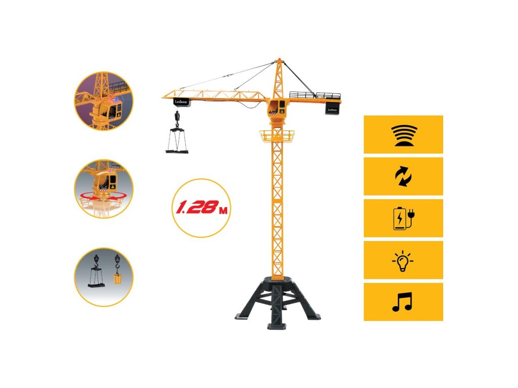 Udělejte z dětí opravdové stavbyvedoucí díky tomuto multifunkčnímu jeřábu! Jeřáb je ovládán ve všech směrech pomocí dálkového ovladače 2,4GHz, který zajišťuje plynulý a bezproblémový provoz. Jeřáb dokáže zvednout až 500 g materiálu s přiloženým kbelík a košem. S působivou výškou 1,28 metru nabízí hračka realistický zážitek, doplněný zvukovými a světelnými efekty.