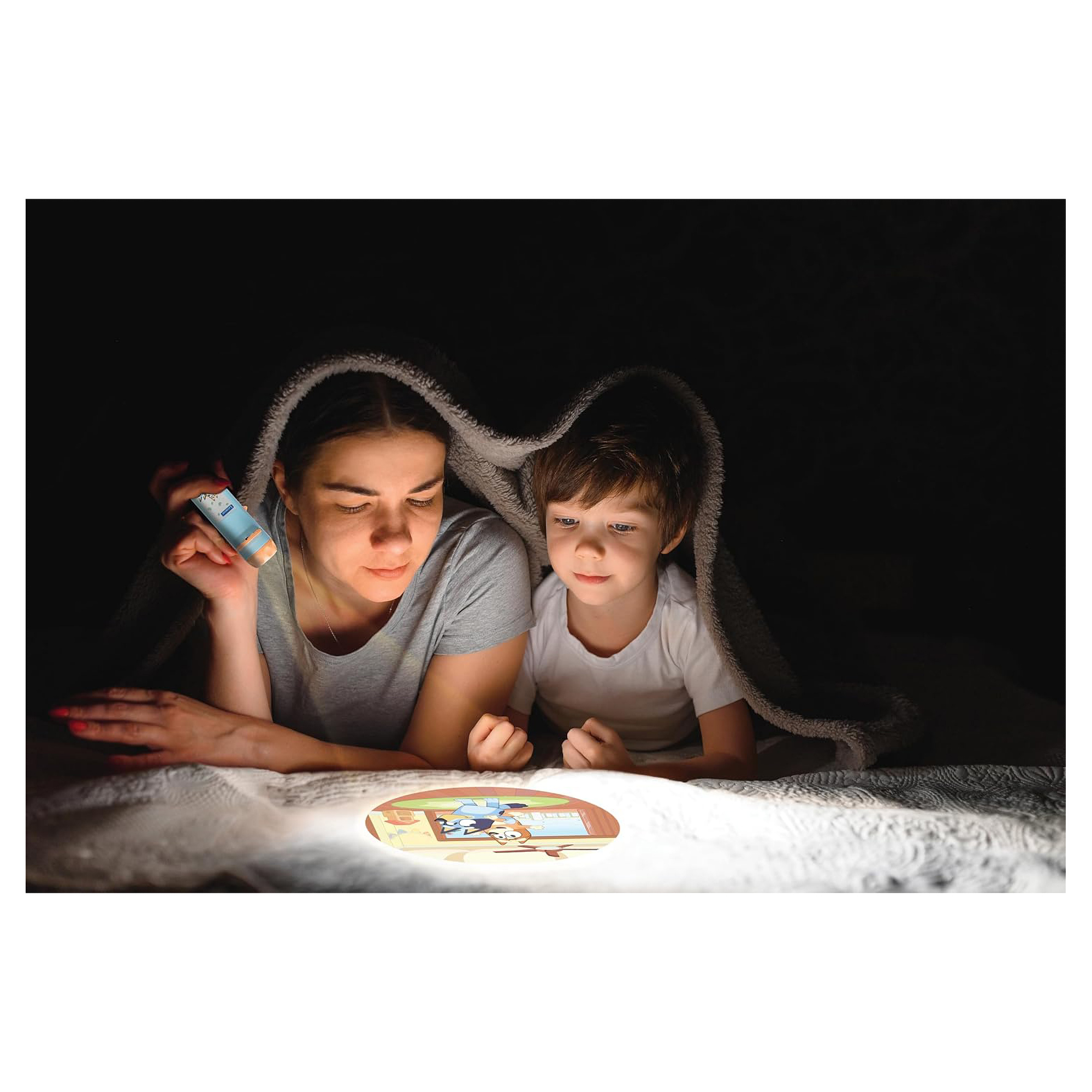 Díky 24 obrázkům na třech discích mohou děti sledovat, jak jejich oblíbení hrdinové ožívají přímo v pokoji. Stačí vložit disk, otáčet snímky a promítat je na zeď či strop. Projektor 2 v 1 po vyjmutí disku slouží i jako malá praktická baterka s jemným bílým LED světlem, což dětem přijde vhod na noční cestu do koupelny nebo při hledání plyšáka.
