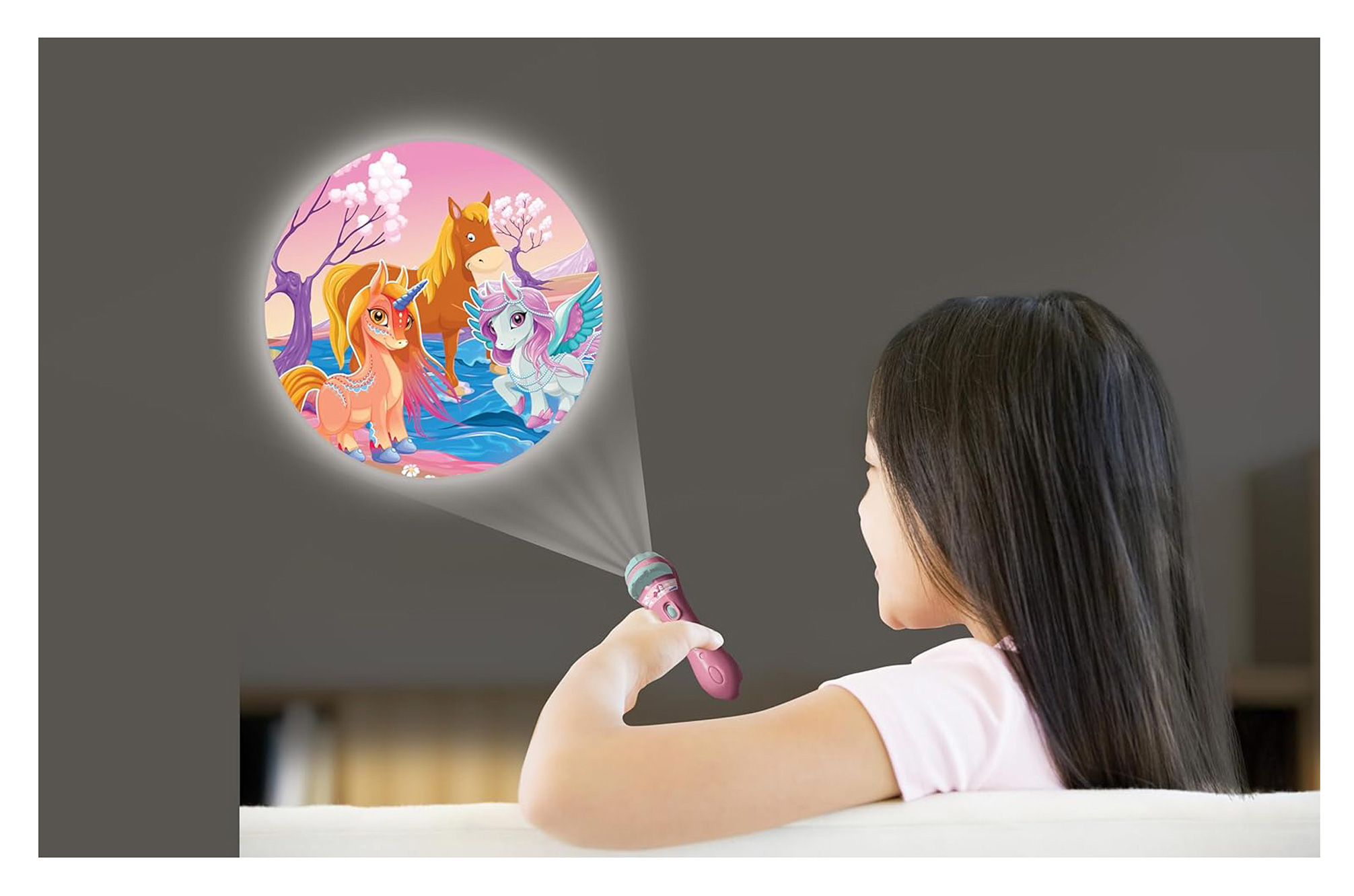 Díky 24 obrázkům na třech discích mohou děti sledovat, jak příběh jejich oblíbených hrdinů ožívá přímo v jejich dětském pokoji. Jednoduše vložte disk do přihrádky (vždy pouze jeden) a jemným otáčením snímky obměňujte. Vytvářejte vlastní scénáře prostřednictvím obrázků, které na sebe navazují v logickém pořadí. Promítejte ve tmě na zeď nebo strop a proměňte váš pokoj v malé divadlo. Tento projektor 2 v 1 funguje po odebrání disku jako praktická baterka s jemným bílým LED světlem, což dětem přijde vhod na noční cestu do koupelny nebo při hledání plyšáka.