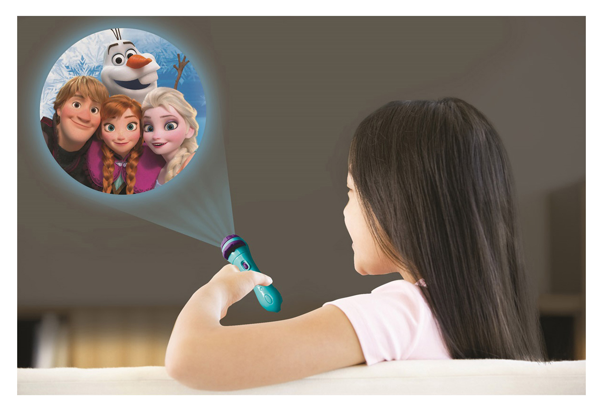 Díky 24 obrázkům na třech discích mohou děti sledovat, jak příběh jejich oblíbených hrdinů ožívá přímo v jejich dětském pokoji. Jednoduše vložte disk do přihrádky (vždy pouze jeden) a jemným otáčením snímky obměňujte. Vytvářejte vlastní scénáře prostřednictvím obrázků, které na sebe navazují v logickém pořadí. Promítejte ve tmě na zeď nebo strop a proměňte váš pokoj v malé divadlo. Tento projektor 2 v 1 funguje po odebrání disku jako praktická baterka s jemným bílým LED světlem, což dětem přijde vhod na noční cestu do koupelny nebo při hledání plyšáka.
