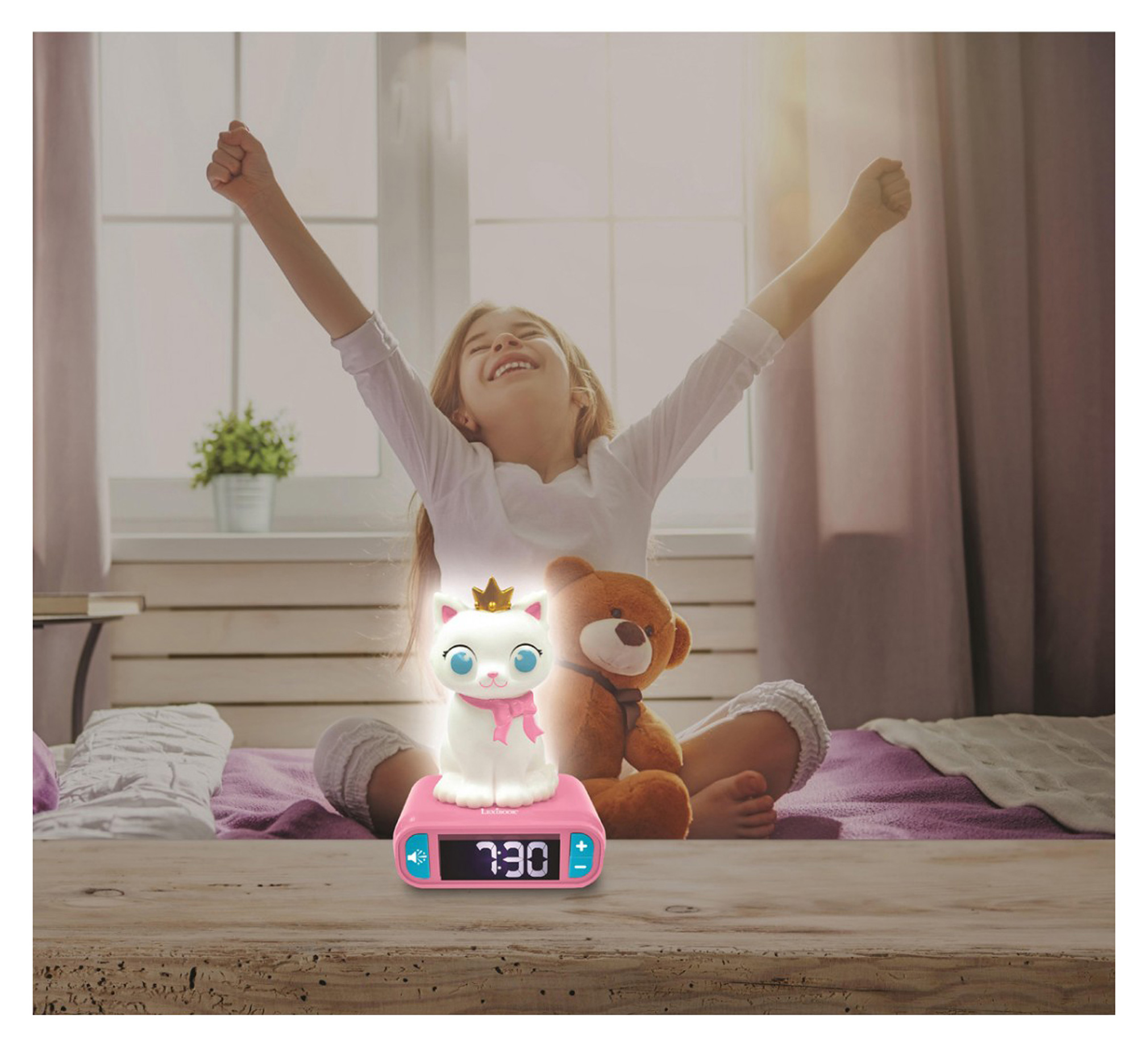 Tento roztomilý budík má všechno potřebné pro zajištění klidné noci a senzačního rána! S uživatelsky přívětivými ovládacími tlačítky můžete hodiny lehce nastavit v režimu 12/24 hodin a stejně tak i čas budíku; to vše dobře viditelné na podsvícené LCD obrazovce nenarušující spánek. Na výběr máte ze šesti různých tematických tónů budíku a extra tlačítka se šesti tematickými zvukovými efekty pro ještě větší zábavu! Můžete nastavit hlasitost, aby postupně rostla nebo rovnou zvolit vyšší úroveň. A co je na něm to nejlepší? Rozhodně zářící 3D noční světlo, které se rozsvítí při stisknutí horní části zařízení nebo když zazvoní budík! Navíc se světlo automaticky zhasne po dvou minutách nebo když horní část znovu stisknete. Chcete-li vypnout budík, stačí jen stisknout jeho horní část. A pro ty, kteří se chtějí dál válet v posteli, je tu funkce odložení, která přinese dalších devět minut spánku!
