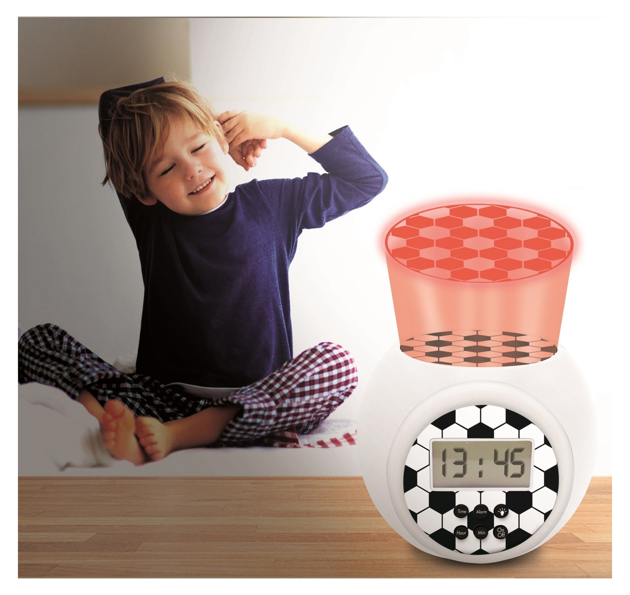 Budík s projektorem vykouzlí příjemnou atmosféru v dětském pokoji před tím, než se vaši nejmenší odeberou ke spánku. Roztomilý budík kulatého tvaru promítne na strop tematický obrázek a zároveň funguje jako noční světlo, které automaticky mění tři barvy – oranžovou, modrou a červenou. Jednoduchým stisknutím tlačítka se žárovkou aktivujete automatický časovač vypnutí světla. Podsvícený LCD displej zobrazuje čas ve 12 nebo 24hodinovém formátu, který snadno nastavíte díky uživatelsky přívětivým tlačítkům. Stejně lehce nastavíte budík (alarm), kdy se v horní části displeje zobrazí ikonka zvonku pro potvrzení. Ti, kteří si rádi dopřejí 5 minut spánku navíc, ocení funkci odložení budíku, kterou aktivujete jednoduchým stisknutím tlačítka se žárovkou.