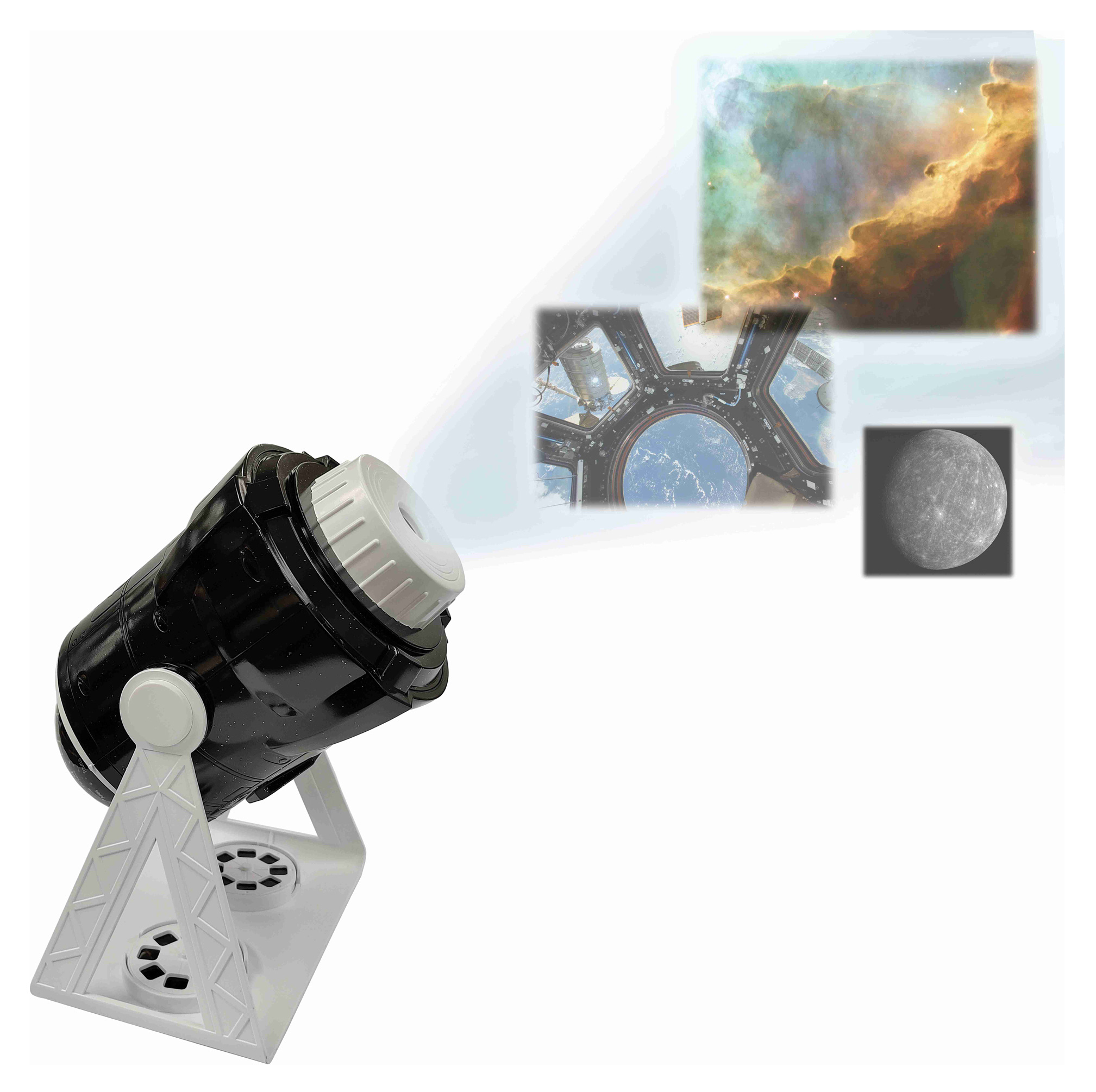 Motorizovaná 360° projekce promění strop v dětském pokoji ve skutečnou podívanou na hvězdnou krajinu! Toto zábavné planetárium s 2 vyměnitelnými kopulemi pro promítání souhvězdí a učení jejich názvů a 3 vyměnitelné disky s 24 obrázky vesmírných lodí, prvních kroků na Měsíci, planet, mlhovin a galaxií promění pokoj ve vizuální zážitek plný tajemství vesmíru. Projektor je mluvící a seznamuje děti s tím, co se zrovna promítá pro zlepšení jejich znalostí, ve francouzštině a angličtině. Promítání funguje na většině povrchů. Nádherné obrazy galaxií a souhvězdí lze promítat na stěnu, na strop nebo dokonce projekční plátno. Pro změnu obrázku stačí otočit diskem a zaostření lze upravit pomocí zaostřovacího kroužku. Děti budou nadšené z promítání hvězdné scény přímo u nich v pokoji.