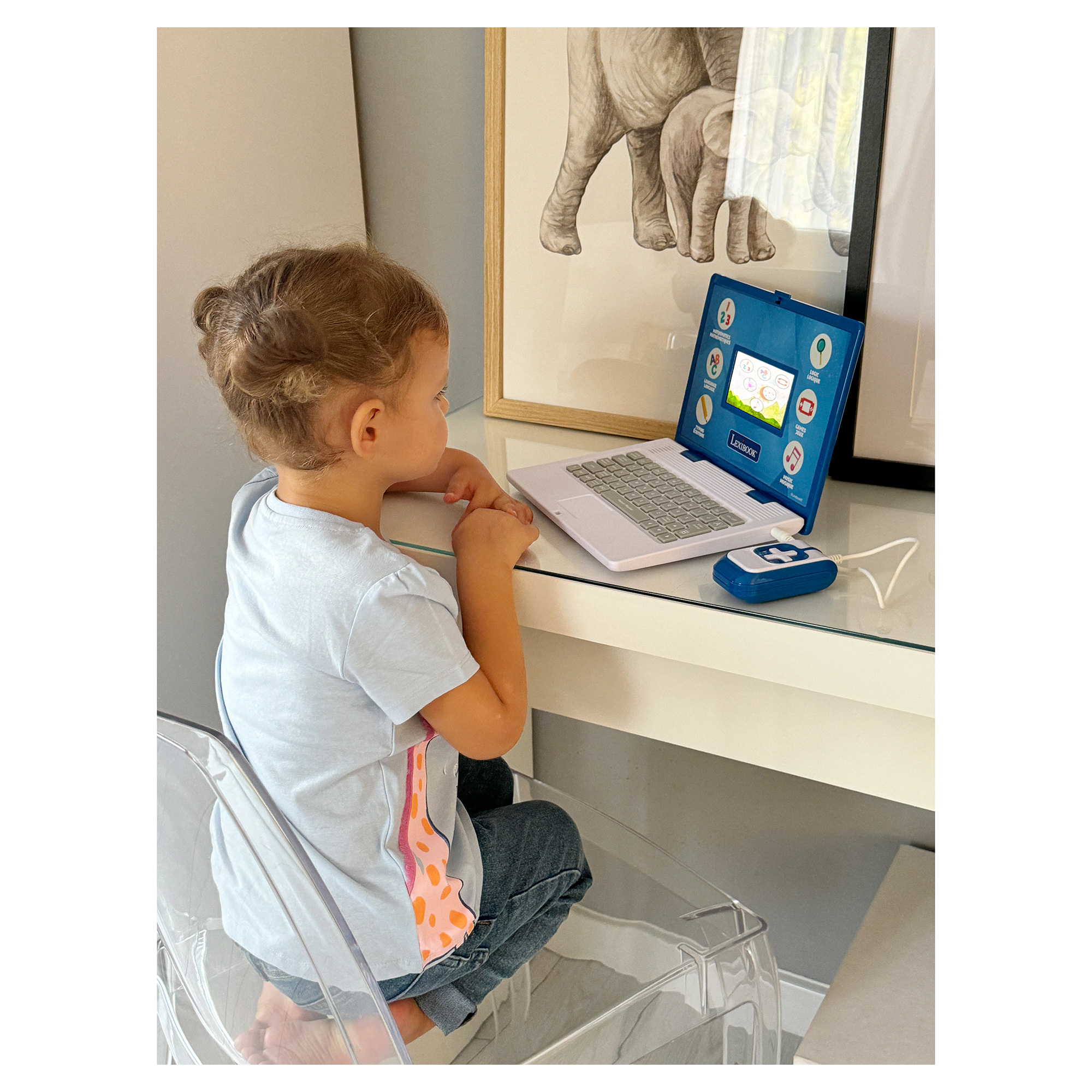 Pokud hledáte způsob, jak do herních aktivit zapojit prvek vzdělávání, pak je tento dětský notebook ideální volbou. Podoba s opravdovým notebookem, reálná myš a LCD barevný displej o velikosti 4,8 x 9,6 cm je lákadlem pro všechny malé nadšence, kteří se chtějí přiblížit dospěláckému světu. 130 aktivit z různých oblastí, z nichž polovina je v angličtině a druhá polovina ve francouzštině, je určeno k zábavnému a interaktivnímu učení, trénování a zlepšování všeobecných dovedností. Na výběr je matematika, kde se děti naučí nejen čísla, ale také základní početní operace. Výuka dvou jazyků je seznámí s písmeny, slovy a výslovností a dvojjazyčná klávesnice jim umožní vyzkoušet si psaní. Hraní paměťových her jim pomůže potrénovat logiku a opomenuta není ani hudba, kde děti určují správné znění melodií. V notebooku najdete také hry a kreslení.