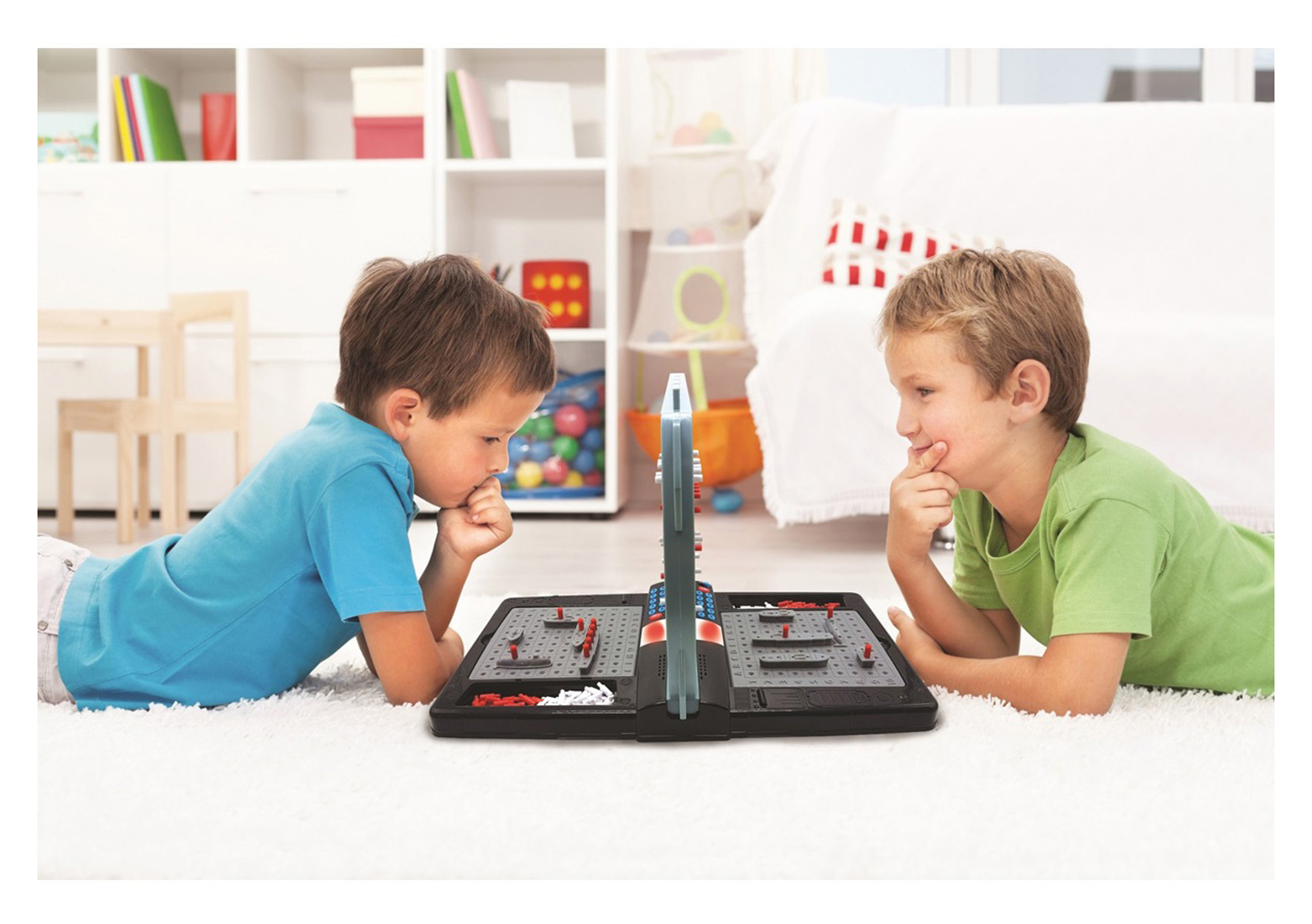 Hrávali jste jako malí strategickou hru lodě? Představte ji vašim dětem v moderní podobě! Mluvící elektronická hra s námořními bitvami pro dva hráče zabaví děti na dlouhé chvíle. Bojovat můžete proti sobě nebo proti počítačovému soupeři. Začít je snadné – jednoduše rozestavte svých pět lodí na mřížce oceánu, zadejte souřadnice ke každé lodi a pak už jen střílejte. Zvolte písmeno a číslo cílové souřadnice a stisknete tlačítko "PAL". Snažte se strategicky potopit soupeřovu flotilu dříve, než on zničí tu vaši. Červenými a bílými kolíčky si značte úspěšné a neúspěšné zásahy (na horní mřížce značte vaše zásahy, na dolní soupeřovy). Vyberte si ze dvou herních režimů – snadný režim nebo obtížný režim, ve kterém počítač neurčuje typ zasažené lodi. Součástí hry jsou realistické bojové zvuky a blikající světla po potopení nebo zasažení plavidla. Tak vzhůru do boje!
