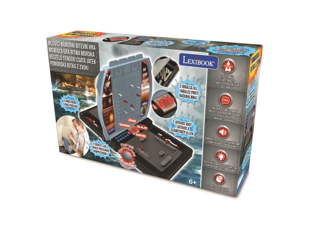Hrávali jste jako malí strategickou hru lodě? Představte ji vašim dětem v moderní podobě! Mluvící elektronická hra s námořními bitvami pro dva hráče zabaví děti na dlouhé chvíle. Bojovat můžete proti sobě nebo proti počítačovému soupeři. Začít je snadné – jednoduše rozestavte svých pět lodí na mřížce oceánu, zadejte souřadnice ke každé lodi a pak už jen střílejte. Zvolte písmeno a číslo cílové souřadnice a stisknete tlačítko "PAL". Snažte se strategicky potopit soupeřovu flotilu dříve, než on zničí tu vaši. Červenými a bílými kolíčky si značte úspěšné a neúspěšné zásahy (na horní mřížce značte vaše zásahy, na dolní soupeřovy). Vyberte si ze dvou herních režimů – snadný režim nebo obtížný režim, ve kterém počítač neurčuje typ zasažené lodi. Součástí hry jsou realistické bojové zvuky a blikající světla po potopení nebo zasažení plavidla. Tak vzhůru do boje!