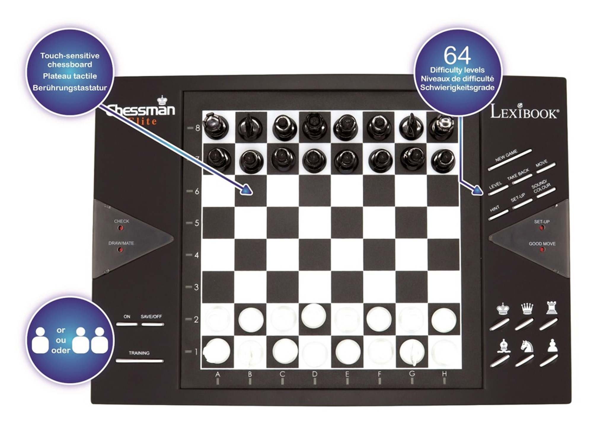 ChessMan Elite je elektronická interaktivní šachovnice, která byla navržena pro snadnou výuku a zdokonalení šachových dovedností. Tato sofistikovaná šachová hra má LED diody (horizontální a vertikální), které zaznamenávají provedené tahy a vyniká díky systému ELO 1800, který hodnotí hráčův výkon. Hru si mohou hráči vychutnat ve dvou nebo se postavit výzvě automatického protihráče. S 64 herními úrovněmi rozdělenými do 4 různých herních stylů (normální, útočný, obranný, riskantní) lze hru přizpůsobit každému hráči. Začínající hráči se mohou naučit hrát díky 5 úrovním pro děti a začátečníky, ve kterých automatický protihráč podněcuje hráče k postupu tím, že se úmyslně vzdává svých pěšců. ChessMan Elite má tréninkový režim, který hráči naznačí, zda byl zahraný tah optimální a vyzývá k pokusu o nový tah. Umožňuje také naučit se a procvičit si pravidlo 50 tahů, pat, opakovaný tah, povýšení pěšce a rozeznává vzájemné střety. Dokáže vyřešit "mat" partii do 5 tahů nebo analyzovat rozložení figurek až do 24 hodin.