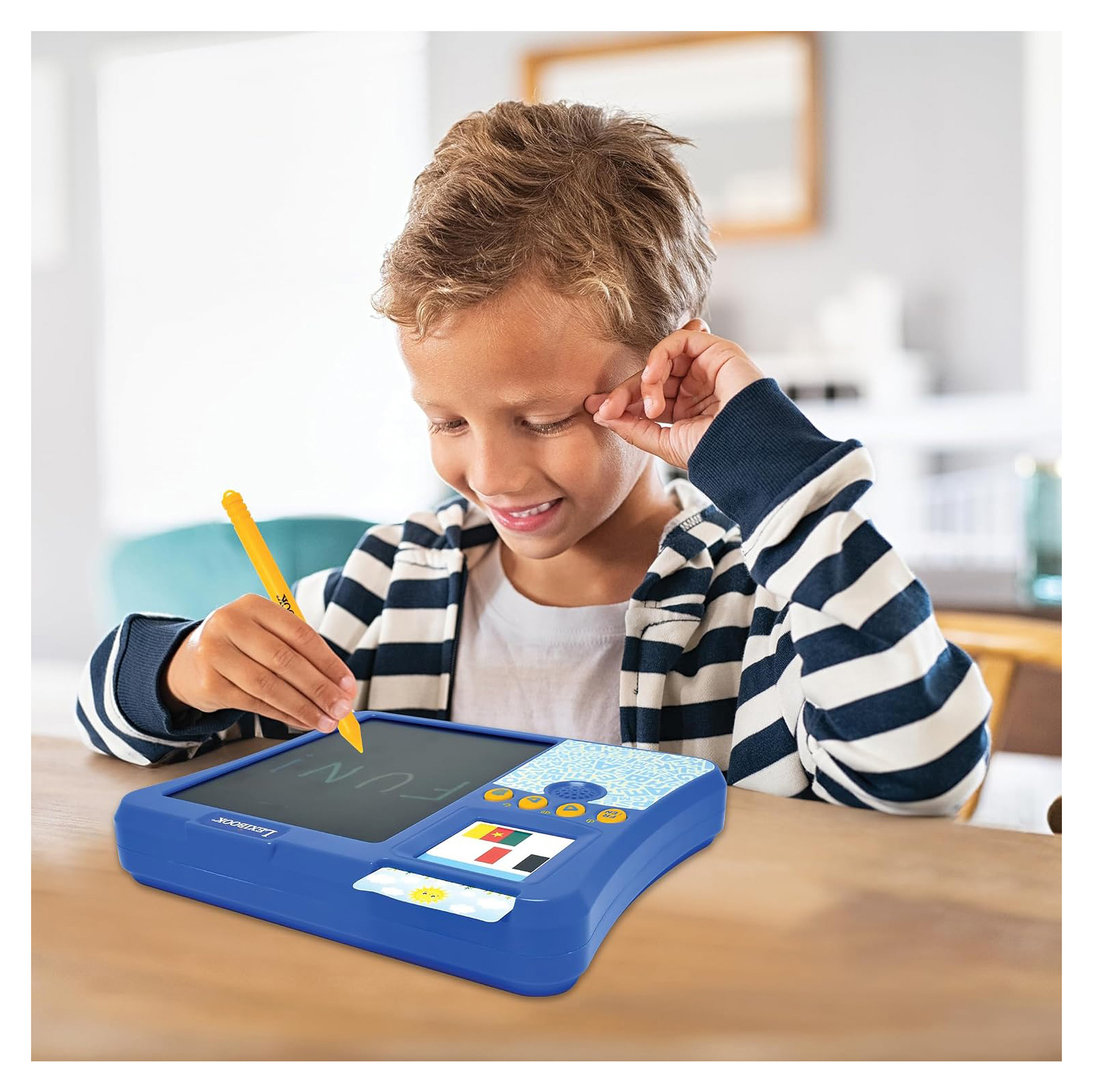 Interaktivní dvojjazyčná mluvící čtečka karet s kreslicím tabletem pomáhá dětem hravou formou objevovat nové pojmy v angličtině i francouzštině. Stačí vložit jednu z 250 oboustranných karet a zařízení vysloví příslušné slovo. Více než 8 tematických okruhů – od zvířat, barev a jídla až po historii, vědu, geografii či hudbu – pomůže budovat širší všeobecný přehled. Pro ověření nově nabytých znalostí slouží kvízový režim s interaktivními otázkami a odpověďmi. Součástí je i tablet s perem, na němž se děti mohou věnovat kreslení nebo psaní během řešení úkolů. Kombinace audio, vizuální a interaktivní výuky spojuje efektivní učení se zábavou.
