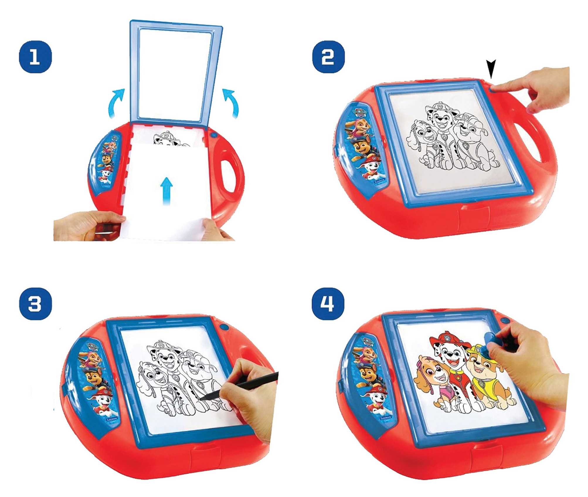 Tento úžasný kreslicí projektor je navržen tak, aby dětem pomohl začít jejich tvůrčí cestu. Kreslení podle deseti přiložených šablon umožňuje dětem vytvořit jejich oblíbené postavičky zcela samostatně. Stačí otevřít plastový kryt a vložit průhlednou šablonu dovnitř projektoru. Poté na šablonu položte list papíru, zavřete víko a stisknutím tlačítka rozsviťte světlo. A umění může začít! Prostřednictvím podsvíceného displeje můžete nyní obrázek ze šablony obkreslit na papír pomocí pera (součástí balení). Čtyři přiložená inkoustová razítka dodají další umělecký nádech. Pokud máte chuť, můžete si vlastní omalovánku vybarvit pastelkami (nejsou součástí balení). Díky perfektní velikosti A5, praktickému vestavěnému úložnému prostoru pro veškeré dodané příslušenství a rukojeti se tento projektor skvěle hodí na cesty nebo na přenášení, kamkoli potřebujete.