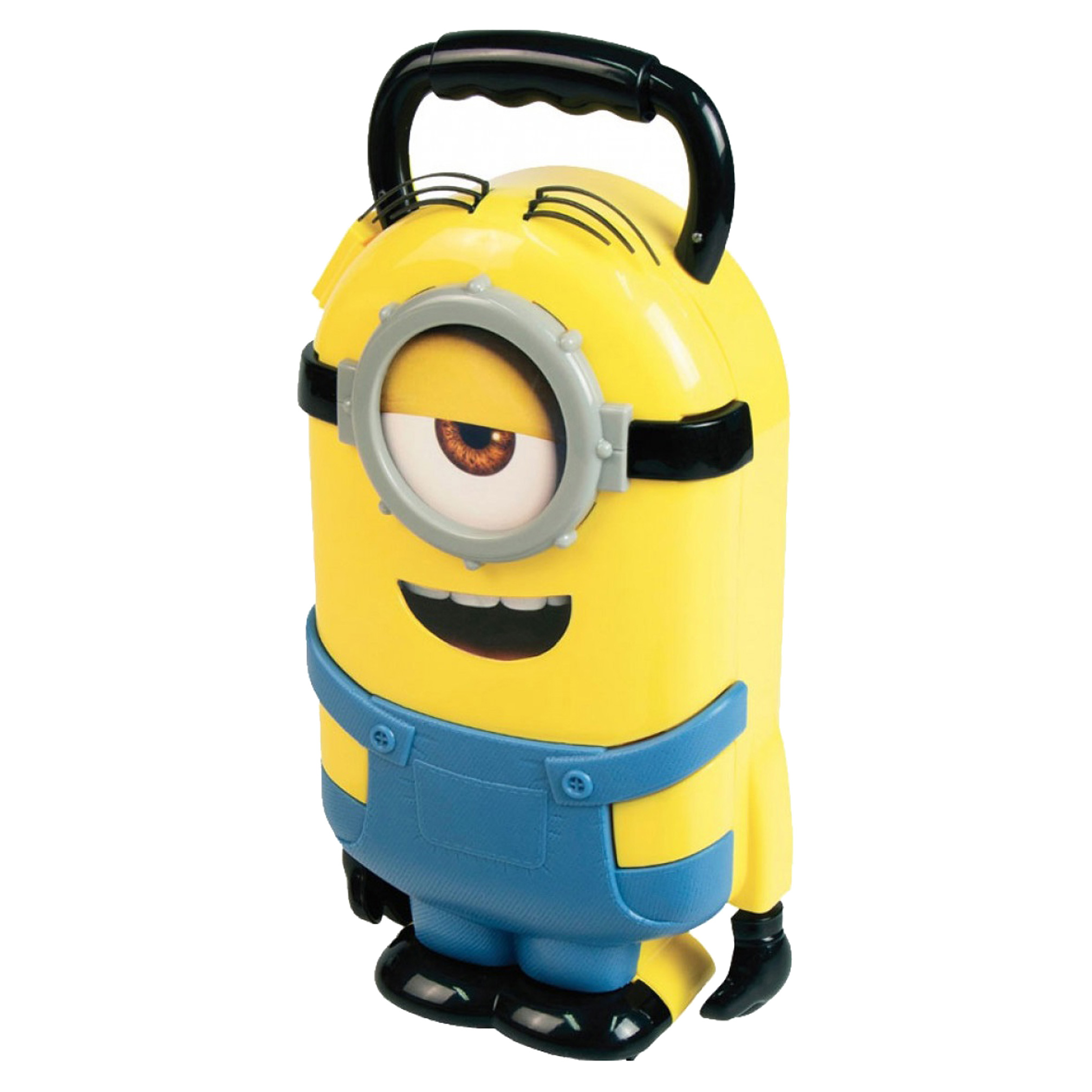 Stylový kufřík ve tvaru Mimoně Stuarta s praktickou rukojetí je skvělým doplňkem pro všechny malé fanoušky. Vnitřek kufříku ukrývá vše, co si děti spojují s touto oblíbenou žlutou postavičkou. Nechybí mini ukulele, které děti znají z filmu a na které si mohou zabrnkat, harmonika ve tvaru banánu a jedna rumba koule. Herní příslušenství se snadno vejde do kufříku a děti si jej mohou vzít kamkoliv s sebou. Kufřík o rozměrech cca 16,50 x 6,60 x 28,80 cm může dětem sloužit i pro přenášení dalších drobností.