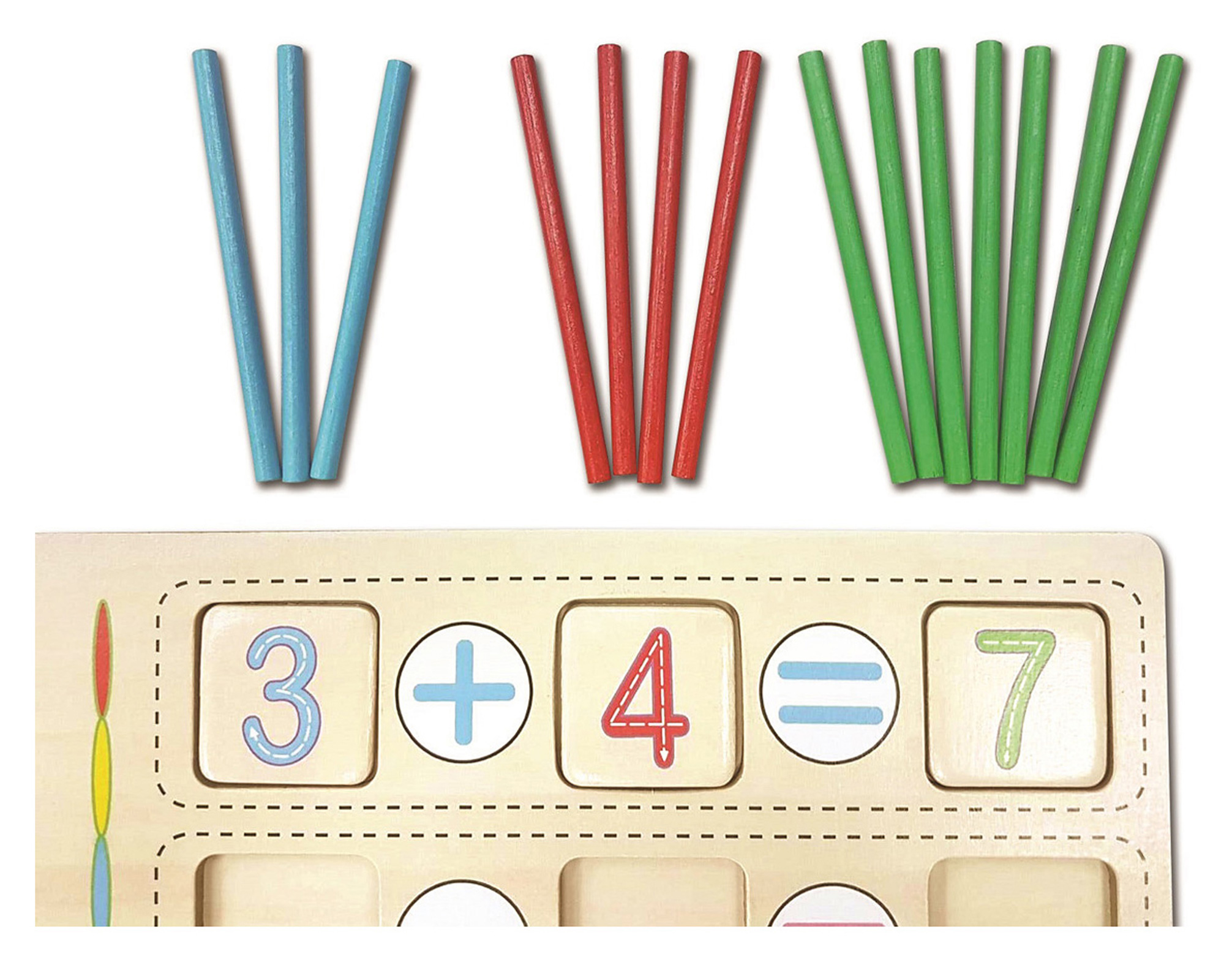 - 105 dřevěných barevných tyčinek k počítání a fyzickému znázornění výpočtů