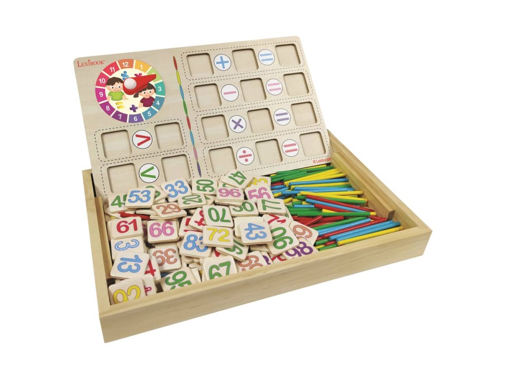 Zapomeňte na nudnou matematiku! S touto hravou školou matematiky v krabičce se učení mění v zábavu. Škola matematiky vyrobená ze dřeva z udržitelného lesního hospodářství nabízí pestrou paletu aktivit pro seznámení se s čísly, matematickými operacemi a mnoho dalších. Víko krabice se stává tabulí, na kterou lze psát křídami na jedné straně a provádět početní operace jako sčítání, odečítání, násobení, dělení nebo porovnávání čísel na druhé straně. K dispozici je sada žetonů s číslicemi od 1 do 100 a 105 dřevěných barevných tyčinek, se kterými děti mohou výpočty a čísla fyzicky znázorňovat. Pro učení se násobilky děti využijí 5 karet s roztomilými ilustrovanými zvířátky. Objevujte s dětmi svět geometrických tvarů, rozpoznávejte barvy a zkoumejte shodná čísla na základě počtu tyčinek a zadaných čísel. Nechybí ani hodiny s ručičkami pro trénink poznávání času. Existuje mnoho různých způsobů, jak školu a její příslušenství používat. Možnosti jsou neomezené!