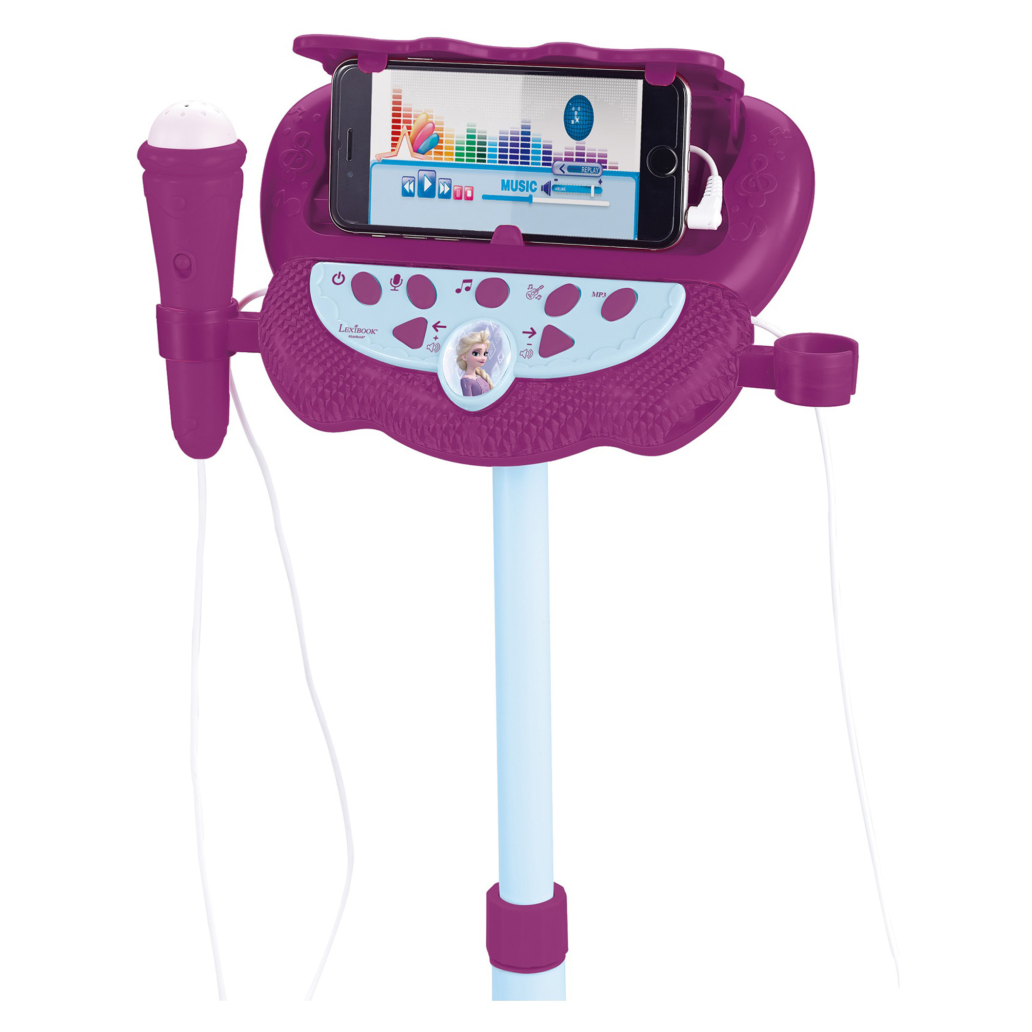 - Nastavitelný stojan s reproduktorem a 2 dětskými mikrofony – Ledové království