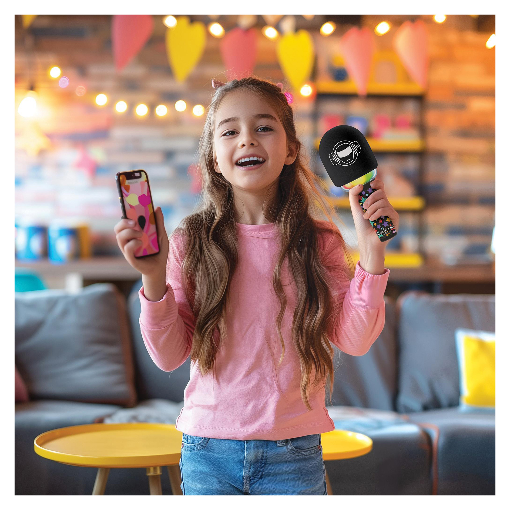 Karaoke mikrofon s integrovaným reproduktorem a barevnými LED světelnými efekty potěší všechny děti, které milují zpívání. Díky Bluetooth® můžete snadno připojit smartphone nebo tablet a užít si neomezený výběr hudby (zařízení nejsou součástí balení). Děti si mohou zpestřit své karaoke vystoupení čtyřmi hlasovými efekty (dětský, robotický, hluboký a velmi hluboký hlas). Mikrofon má nastavitelnou hlasitost a efekt ozvěny. K mikrofonu lze připojit i vlastní sluchátka (nejsou součástí balení).