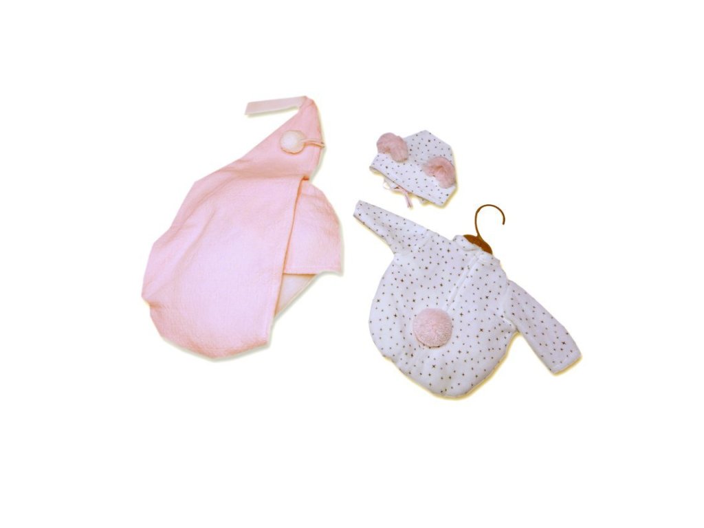 2dílný obleček se závěsným houpacím vakem pro panenku miminko NEW BORN Llorens velikosti 35-36 cm. Vyrobeno ve Španělsku, baleno v igelitovém obalu s plastovým nebo kartonovým ramínkem. Doporučený věk od 3 let.