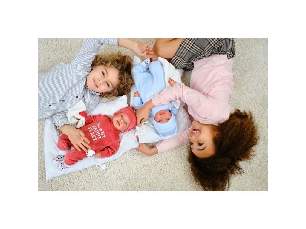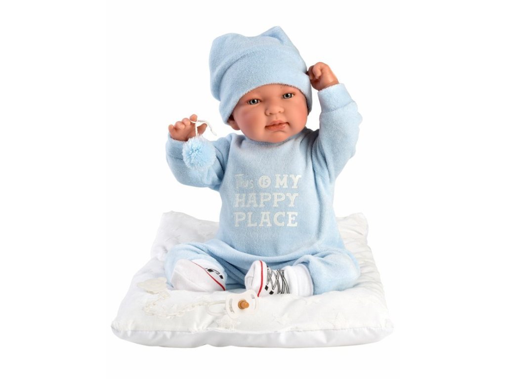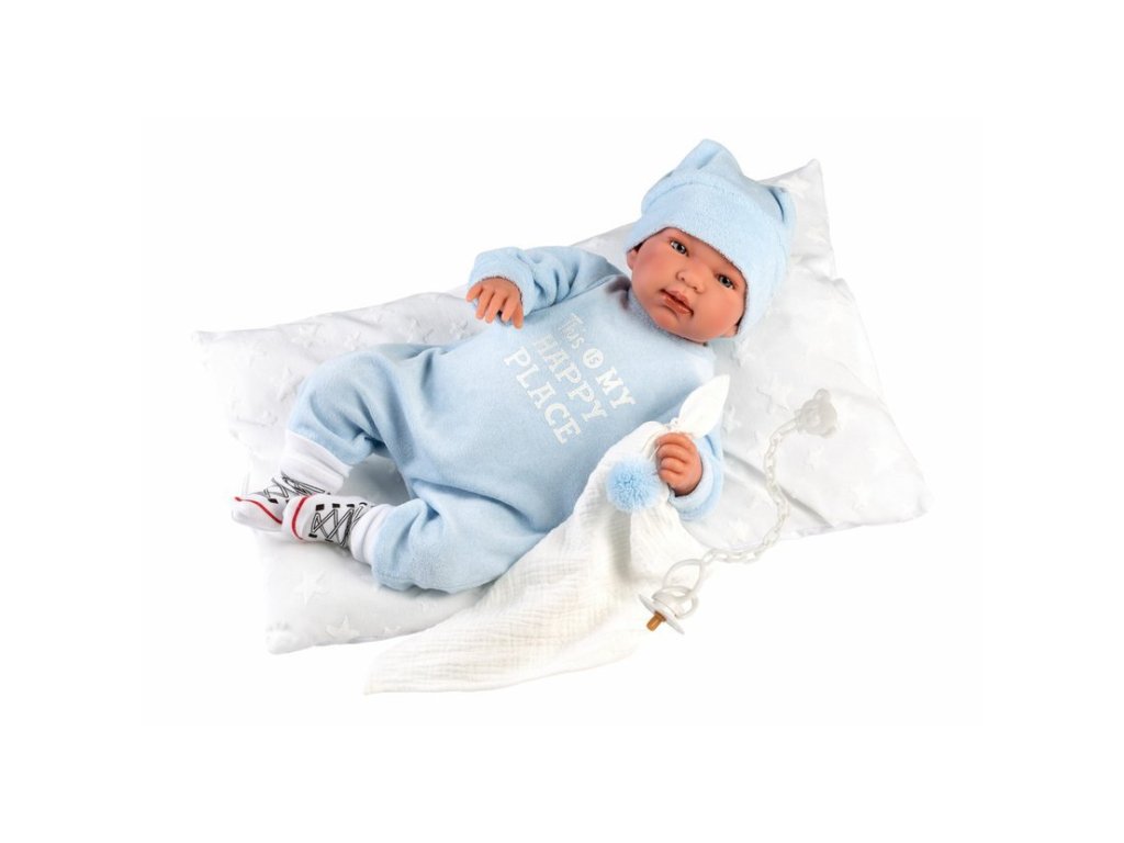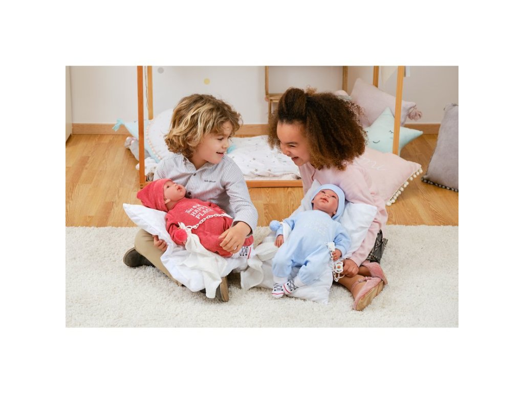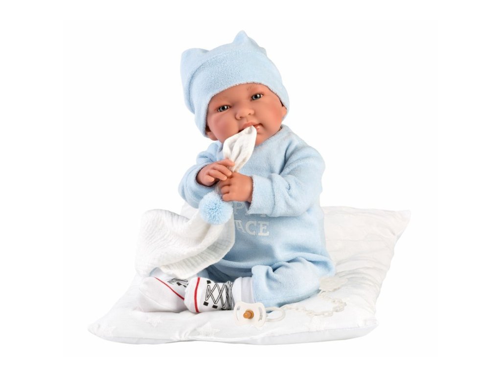3dílný obleček s polštářem využitelným jako podložka a muchlacím kapesníčkem s bambulkou pro panenku miminko NEW BORN Llorens velikosti 43-44 cm. Vyrobeno ve Španělsku, baleno v igelitovém obalu s plastovým nebo kartonovým ramínkem. Doporučený věk od 3 let.