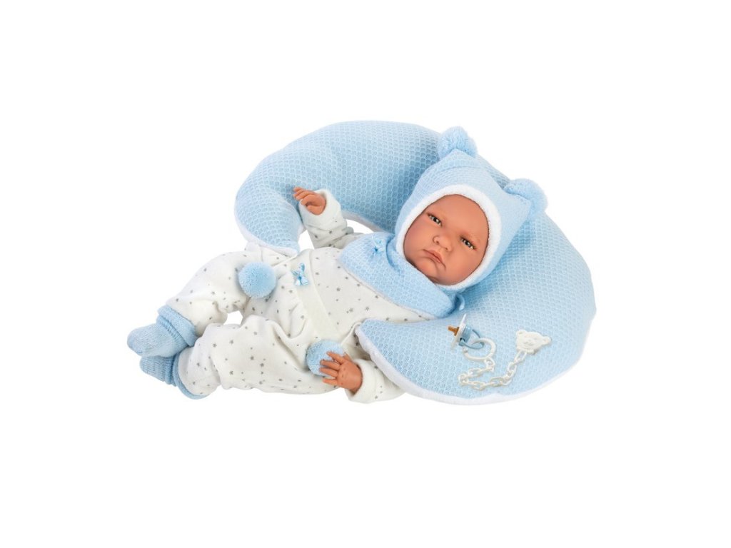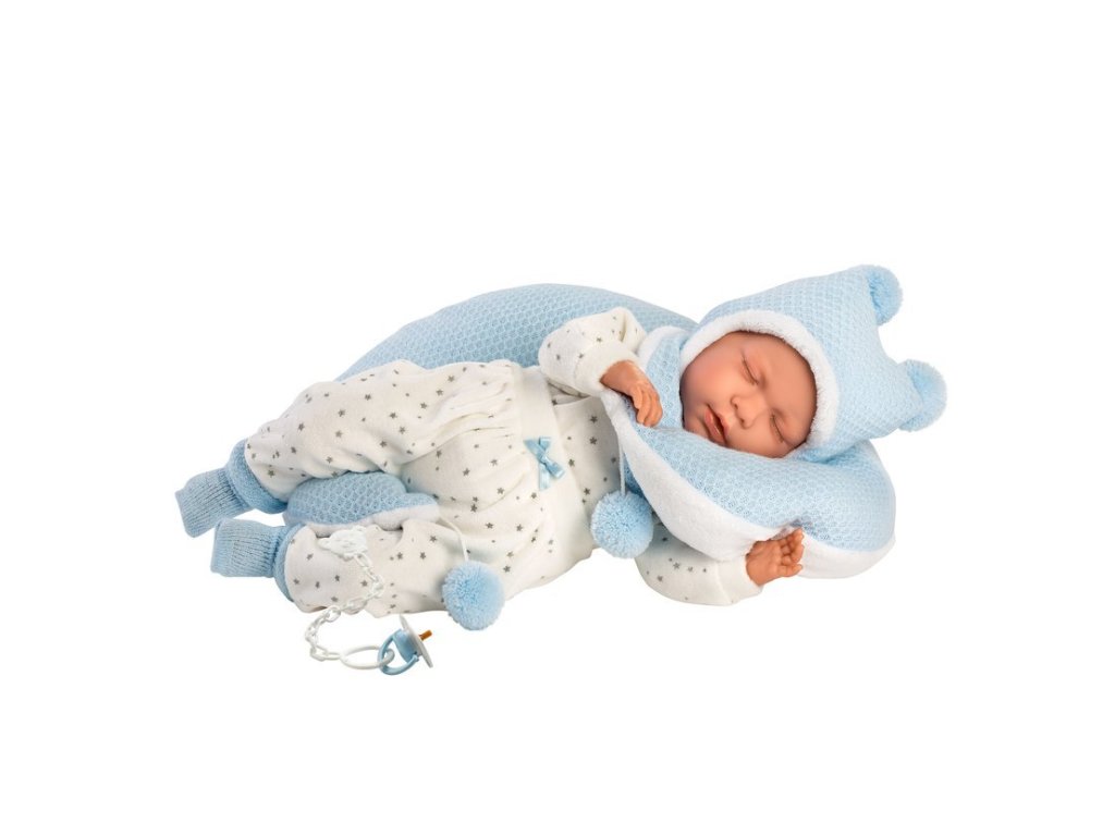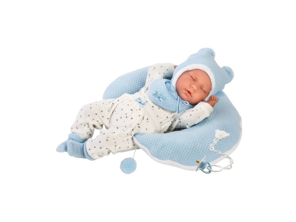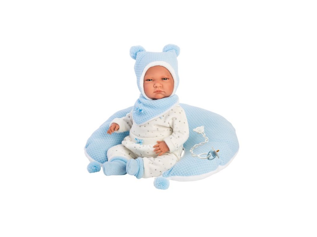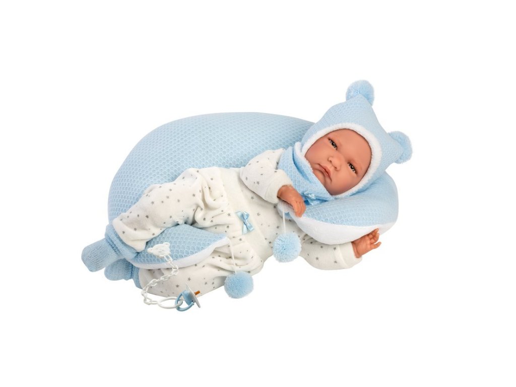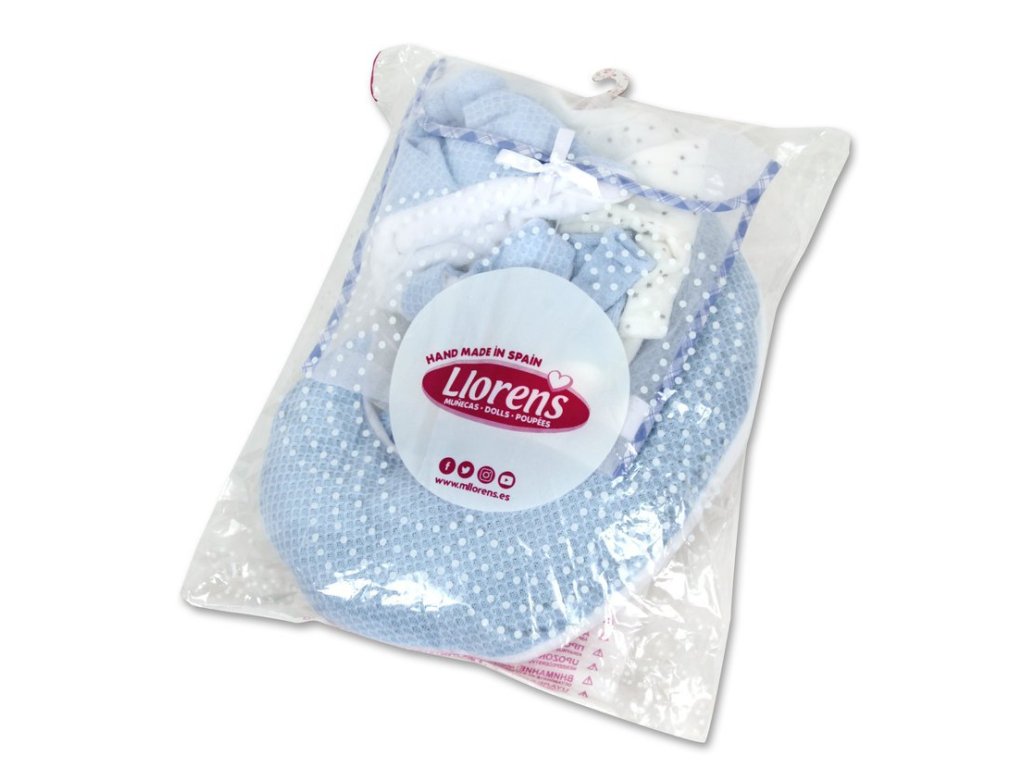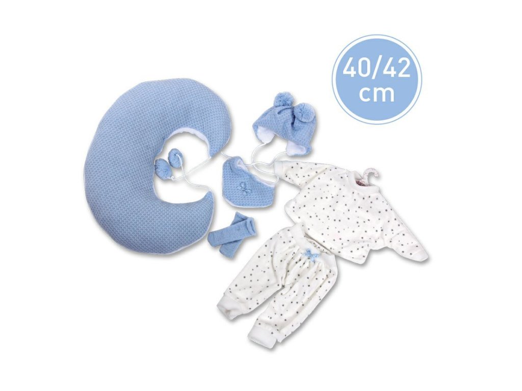 5dílný obleček pro panenku miminko NEW BORN Llorens velikosti 40-42 cm s kojícím polštářem. Vyrobeno ve Španělsku, obleček balen v dárkové ozdobné síťce s kartonovým ramínkem a následně společně s polštářem v igelitovém obalu. Doporučený věk od 3 let.