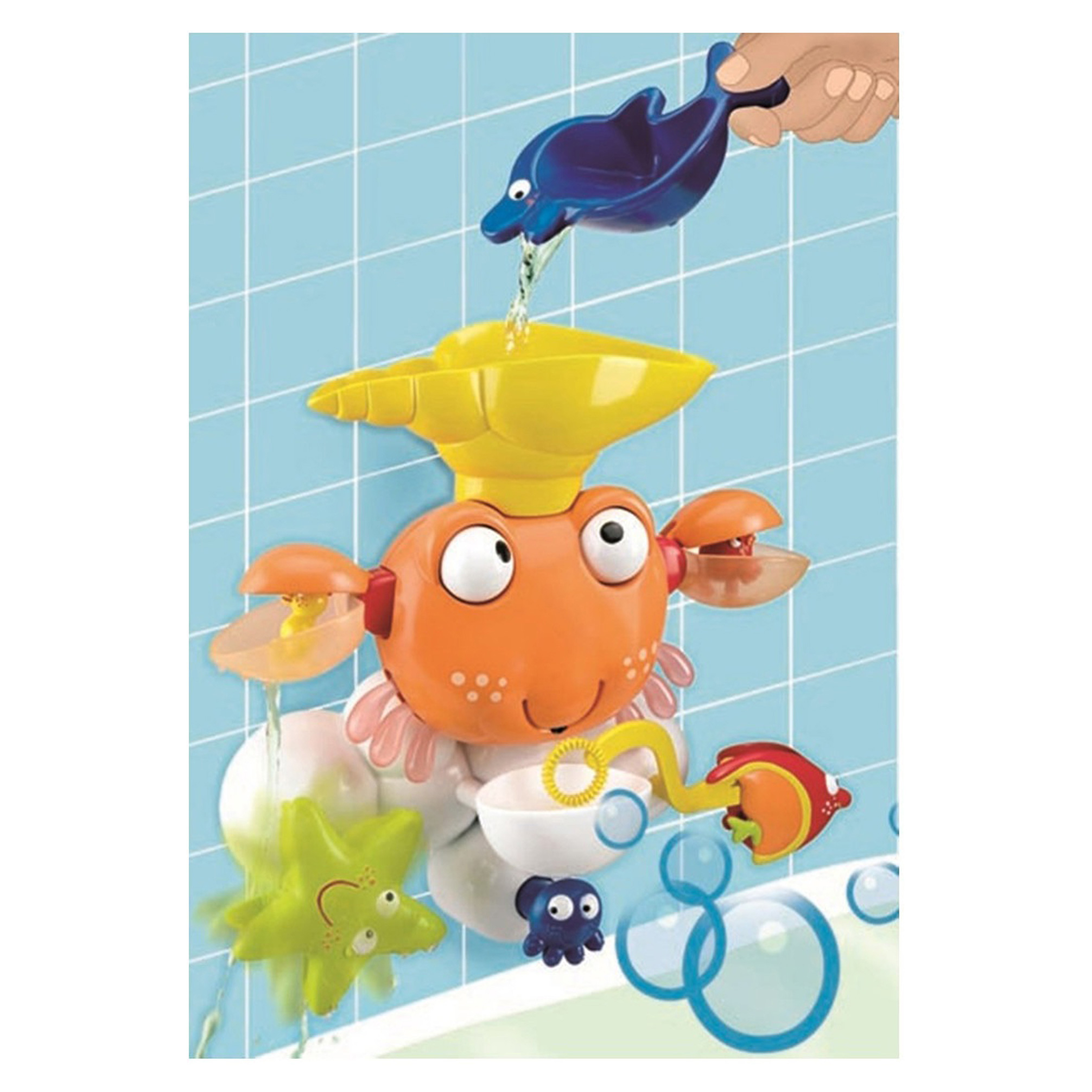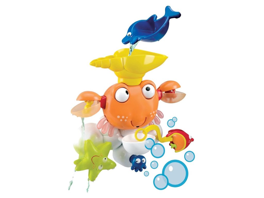 Nevíte si rady, jak děti zabavit během koupání ve vaně? Máme pro vás skvělé řešení! Připevněte barevného kraba pomocí 3 přísavek na vnitřní stranu vany, nalijte vodu na mušli, kterou má na hlavě za pomoci malé lopatky ve tvaru delfína a sledujte, jak se celý mechanismus rozpohybuje. Krab krouží očima, rozevírá klepeta, mořský koník vyskakuje ze svého úkrytu, rybky plavou a hvězdice se točí. Když naplníte přihrádku pod krabí tlamou vodou a pěnou do koupele nebo tekutým mýdlem (mýdlo ani pěna nejsou součástí balení), můžete začít tvořit krásné bublinky, stačí jen zmáčknout chobotnici. Tak hurá do vany!