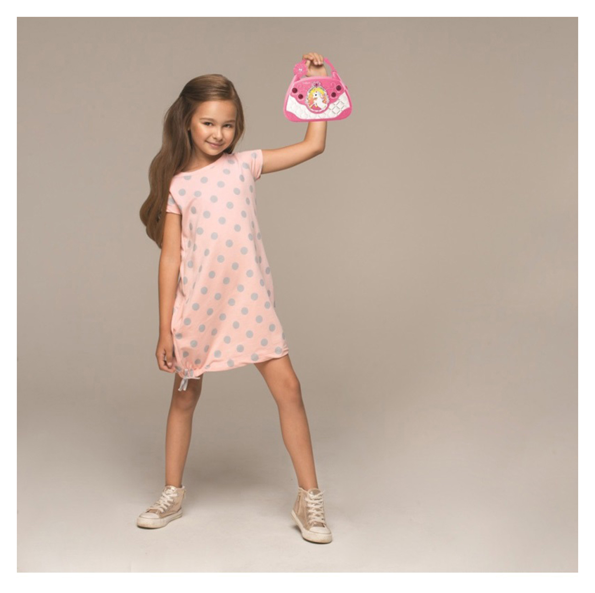 Tento reproduktor ve tvaru kabelky nabízí stylovou hudební zábavu a funkce, díky kterým se vaše děti nebudou nudit. Na dětském mikrofonu můžete měnit efekty hlasu – na vysoký dětský nebo hluboký hlas. Děti ocení snadné ovládání pomocí intuitivních tlačítek a světelné efekty. K dispozici je 20 demo melodií nebo si můžete hudební výběr rozšířit prostřednictvím tabletu, smartphonu či MP3 (nejsou součástí balení), které snadno připojíte díky AUX-in kabelu (součástí balení). Tlačítko "sound effects" ocení snahu dětí potleskem a povzbuzením od publika. V zadní části je tajná přihrádka na drobné předměty a díky rukojeti se kabelka snadno přenáší. Zazpívejte si karaoke, anebo si užijte poslech vašich oblíbených písniček, ať už vyrážíte kamkoliv.