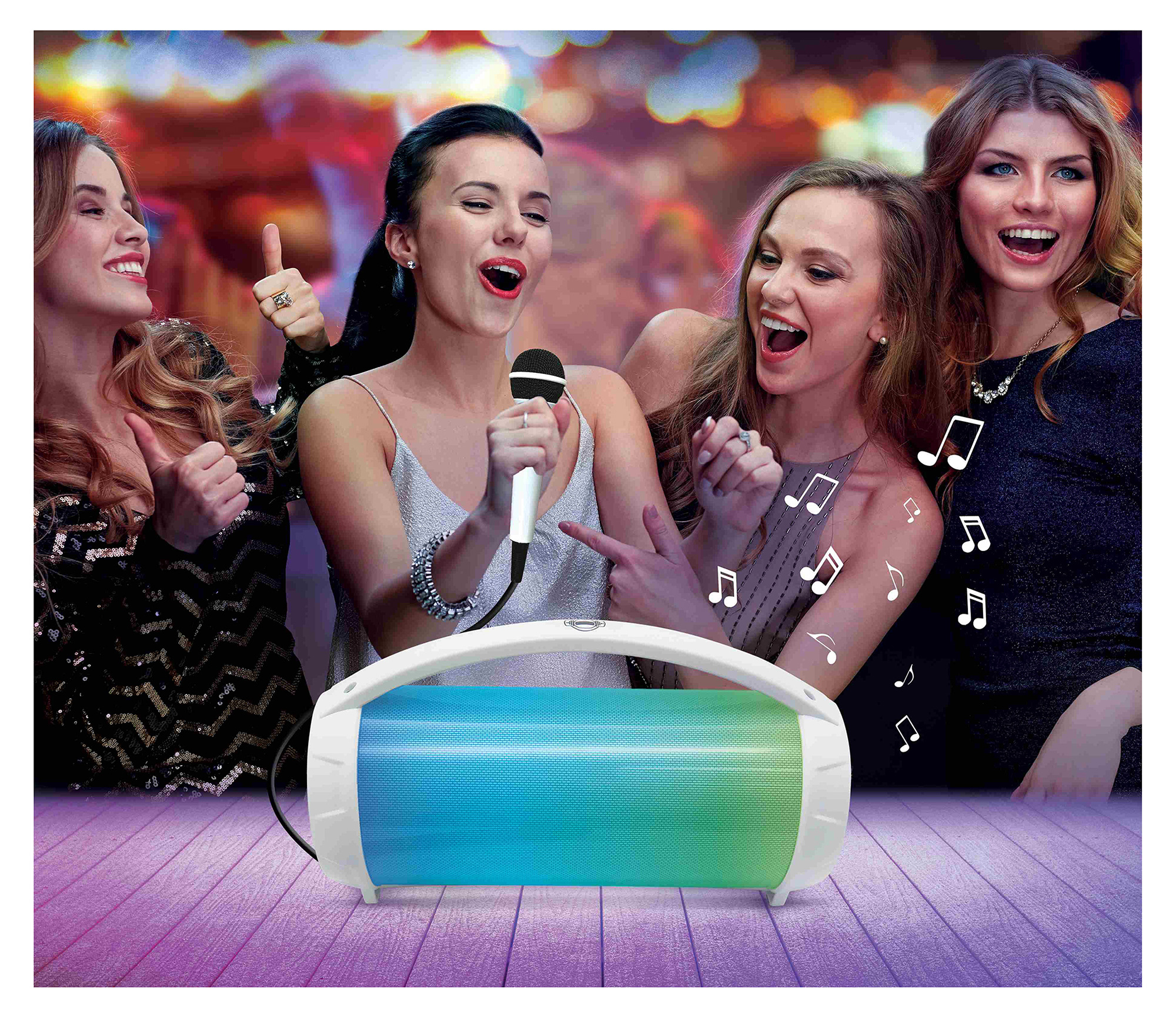 - Reproduktor se může přeměnit v karaoke díky mikrofonu, který je součástí balení