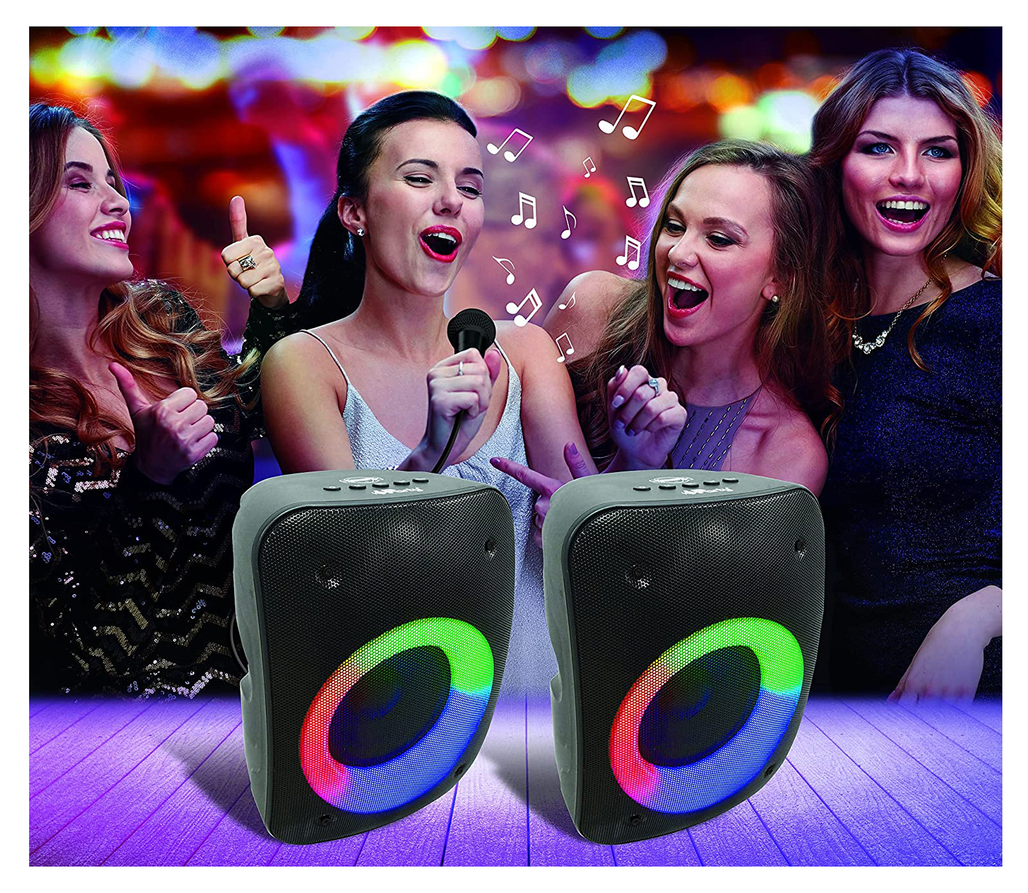 Tato výkonná sada reproduktorů s mikrofonem a s vícebarevnými světelnými efekty je perfektním doplňkem na karaoke párty a pro všechny ty, kteří rádi zpívají kdykoliv a kdekoliv. Reproduktory snadno bezdrátově připojíte ke všem zařízením vybaveným technologií Bluetooth® 5.0, například smartphone nebo tablet. Díky dobíjecí baterii je možné reproduktory přenášet kamkoliv s sebou a užívat si skvělou hudební atmosféru až po dobu 3 hodin. Hudbu lze přehrávat také z dalších externích zdrojů díky USB portu, Aux-in vstupu (kabel je součástí balení) nebo slotu pro paměťové micro karty typu SD/TF do 16 GB (USB disk ani karty nejsou součástí balení). Díky funkci TWS je možné synchronizovat oba reproduktory a vychutnat si dokonalý stereo zvuk. Budete mít dojem, že hudba zní "naživo" přímo u vás doma.