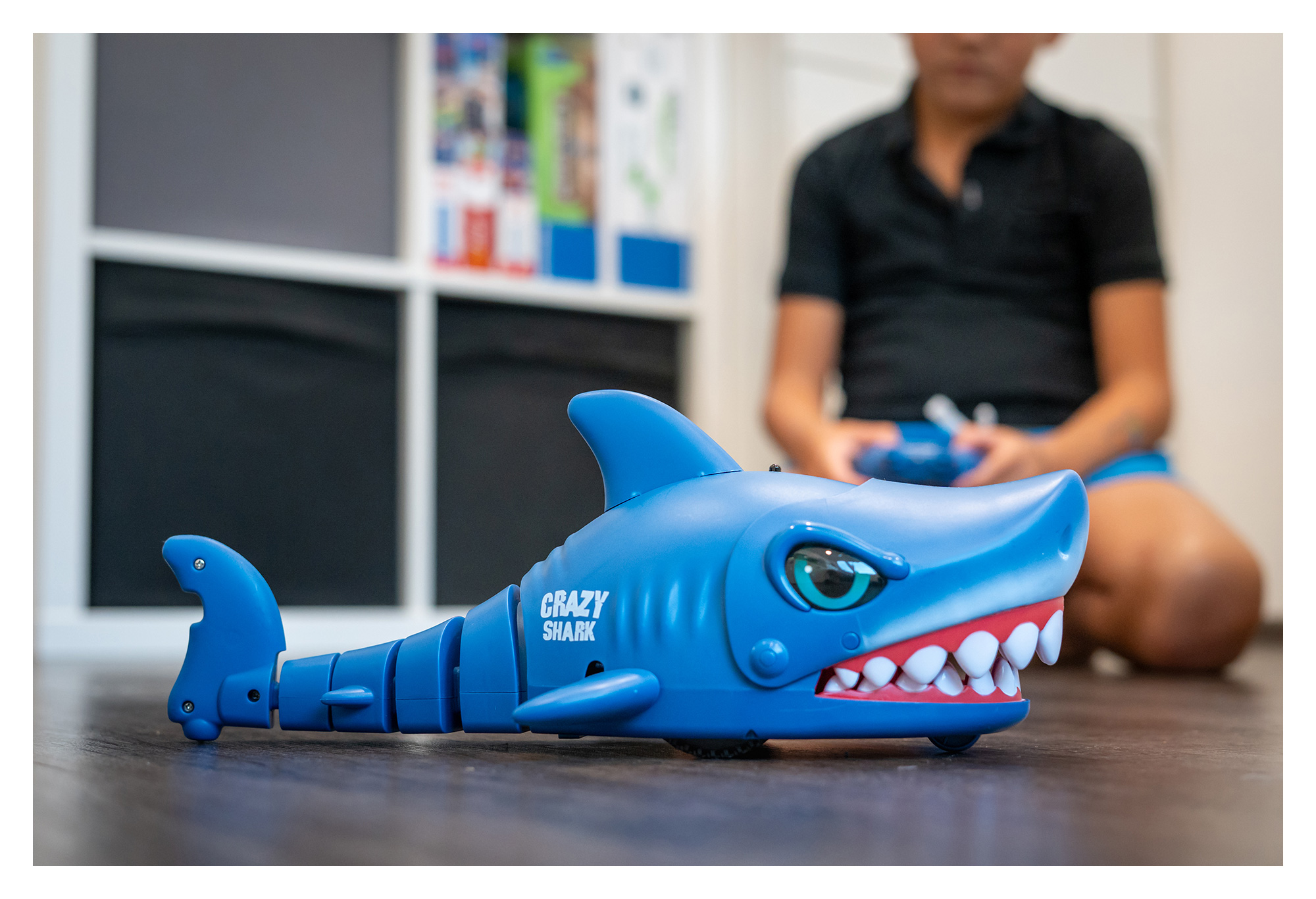 Tento divoký jezdící žralok s odnímatelným ocasem nabízí na rovném povrchu realistické akce, jako je otevírání a zavírání tlamy, simulaci plavání a lovení v moři, spolu se zvukovými efekty. Dokáže se pohybovat všemi směry, a dokonce se umí bláznivě otáčet. Díky snadnému dálkovému ovládání a dvěma zabudovaným kolečkům jsou žralokovy pohyby plynulé a podmanivé. Dokáže dosáhnout rychlosti až 5 km/h! Robotický žralok přehrává hudbu, na kterou předvádí své taneční pohyby. Děti si mohou také vyzkoušet programování a jednoduchým stiskem tlačítek dát žralokovi příkazy k pohybu, které pak následuje.