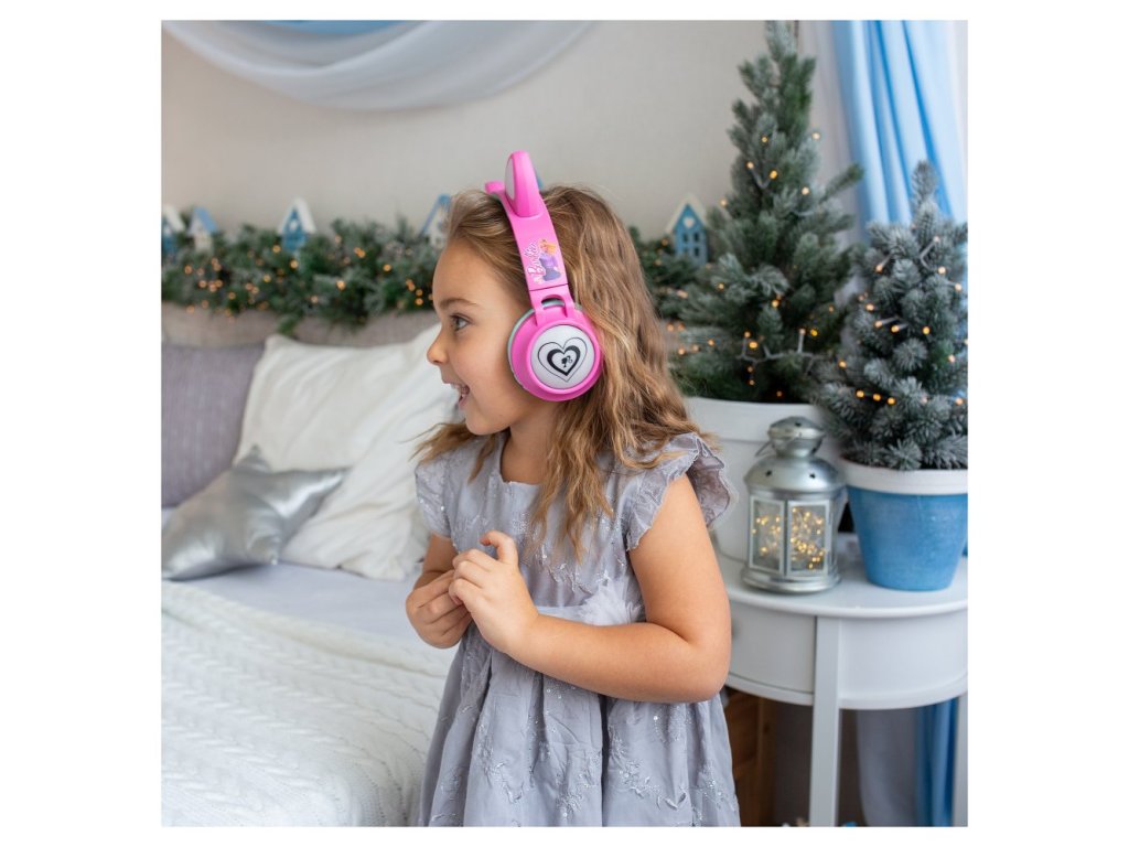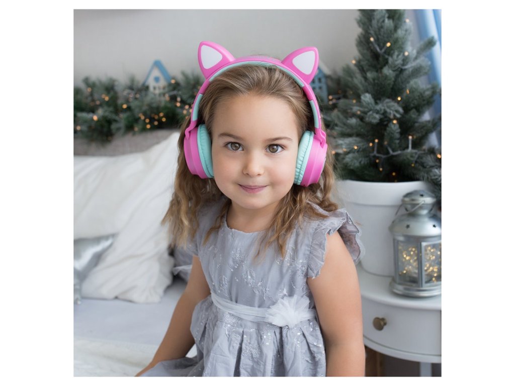 Představujeme praktická sluchátka 2 v 1 vybavená bezdrátovou technologií i možností připojení pomocí kabelu pro nerušený poslech hudby, sledování videí nebo hraní videoher. Děti ocení roztomilý design s kočičíma ušima a měnící se barvy LED světel, když jsou sluchátka zapnutá. Technologie Bluetooth® 5.0 umožňuje bezdrátové připojení do 10 m ke všem kompatibilním zařízením, jako jsou chytré telefony, tablety, audio a video přehrávače. Další možnost pro přehrávání hudby nabízí SD slot pro paměťovou MicroSD kartu (karta není součástí balení). Sluchátka lze snadno přepnout do režimu kabelového připojení pomocí kabelu s 3,5mm jack konektorem (součástí balení). Mají vestavěné ovládací prvky, jako jsou přehrávání/pauza, tlačítka hlasitosti a možnost přepínat skladby. Sluchátka navíc mají integrovaný mikrofon pro přijímání hovorů. Jsou vybavena nastavitelným hlavovým mostem, takže dokonale padnou na každou hlavu a měkkými náušníky pro maximální pohodlí. Tato sluchátka jsou robustní, skládací a vyrobená z lehkého materiálu.