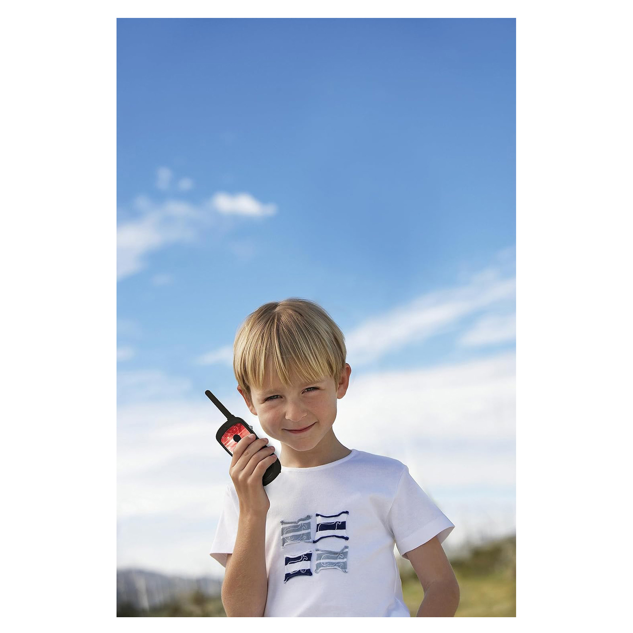 - Dvě vysílačky s dosahem přenosu až 120 metrů venku (v závislosti na terénu a povětrnostních podmínkách, doporučuje se používat na rovném otevřeném prostranství)