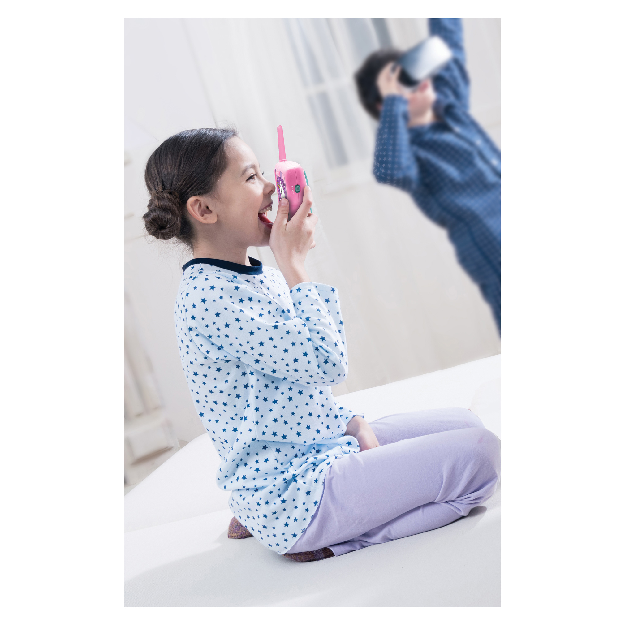 Naše vysílačky nabízejí snadný způsob, jak zůstat ve spojení na krátké vzdálenosti. Tyto vysílačky umožňují komunikaci až do 120 metrů, takže vaše děti mohou zůstat v kontaktu, a to i na túrách a všech outdoorových dobrodružstvích (v závislosti na terénu a povětrnostních podmínkách). Díky uživatelsky přívětivým ovládacím tlačítkům, jako je „TALK“ (MLUVIT), dokonalému designu stvořenému pro malé ručičky a úžasnému digitálnímu zvuku jsou skvělé pro malé děti například při hře na špiony nebo sdílení tajných informací! Navíc mají ohebné antény a odnímatelné klipsy na opasek, takže si je děti mohou připnout tam, kde to je pohodlné.